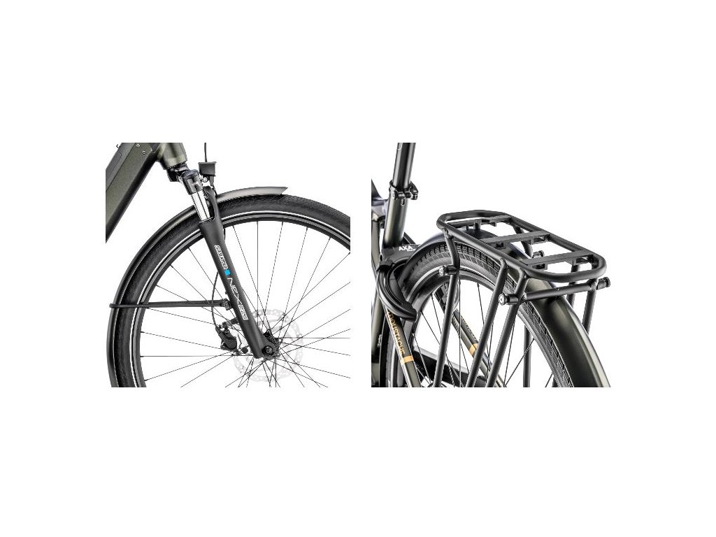 Pro zvýšení praktičnosti je model vybaven nosičem kompatibilním se systémy QL3 a MIK HD, což usnadňuje připevnění brašen a košů, integrovaným osvětlením napájeným z hlavní baterie a rámovým zámkem AXA Block XXL pro zvýšenou bezpečnost.
