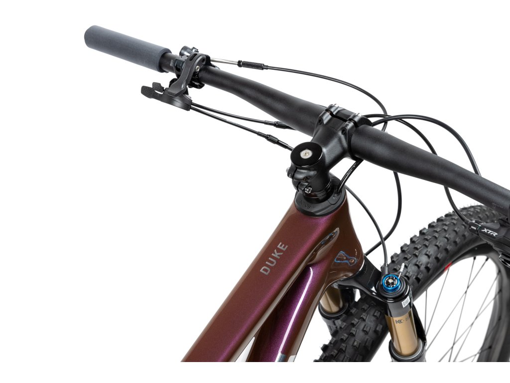 Duke FS Ultimate představuje špičku našich celoodpružených XC MTB. Postavený je na high modulus celokarbonovém rámu s agresivní geometrií, systémem odpružení Zero pivot a kompletně integrovanou kabeláží, která dodává kolu elegantní a čistý vzhled. Komfort a sebedůvěru i na nejtěžších tratích poskytuje jezdci kombinace vidlice Fox 34 SC a tlumiče Fox DPS, obojí v nejvyšší verzi Factory a s dálkovým ovládáním lockoutu. Díky tomu je Duke FS nejen neskutečně jistý ve sjezdech, ale zároveň neztrácí efektivitu při stoupání a v jednodušších pasážích. Standardní teleskopická sedlovka dále podtrhuje schopnosti kola a výrazně rozšiřuje možnosti jeho použití. Kompletní osazení komponenty nejvyšší řady Shimano XTR, spolu s top modelem zapletených kol Fulcrum Red Zone Carbon obutých do lehkých a přilnavých plášťů Continental Cross King Protection, dotahují zážitek z jízdy k dokonalosti. Neporazitelný stroj určený pro ambiciózní jezdce.
